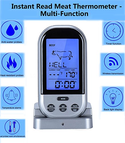 Hohe genauigkeit: 32℉ – 482℉ (0℃ – 250℃, Präzision ± 1.8/1℃), Sondendrähte sind 1 M lang. Das Thermometer wird von 4 AAA Batterien mitgeliefert. Dieses Utensilien ist das Beste für den Einsatz beim Grillen auf Ihrem Gas-Barbecue oder Putenbrat, Süßigkeiten machen, mit heißem Öl zu frittieren, Bier brauen und Wein und sogar machen Käse und Brot.